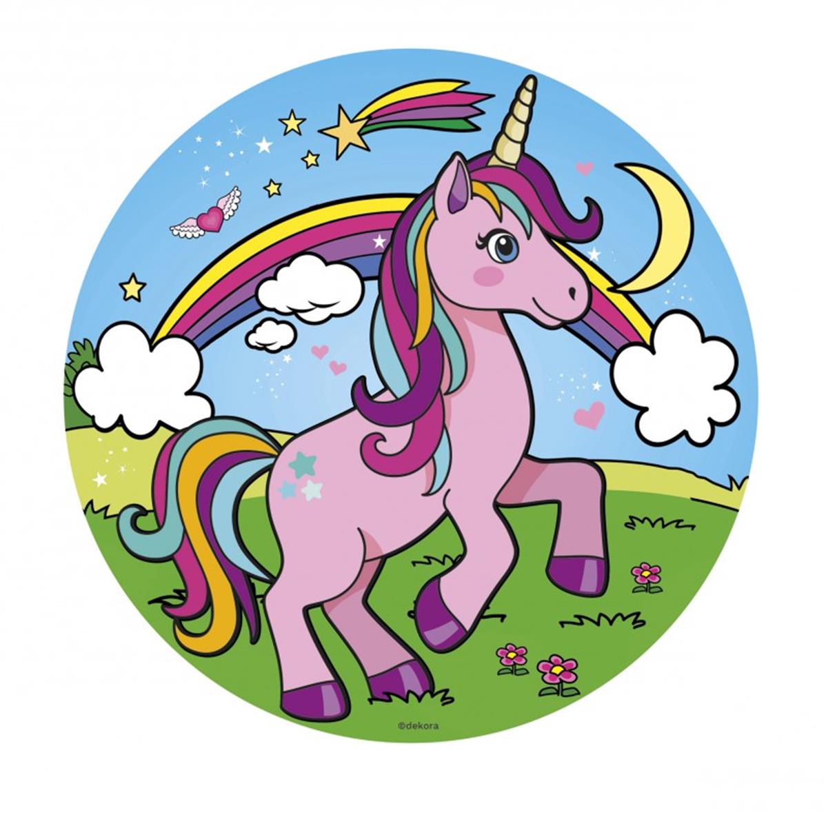 Disque azyme comestible licorne à placer sur un gâteau pour une décoration rapide et jolie. Vous pourrez ainsi facilement créer un univers féérique à l'occasion d'un anniversaire d'enfant sur le thème de cet animal enchanté !